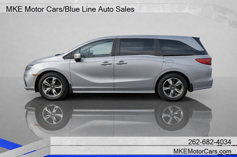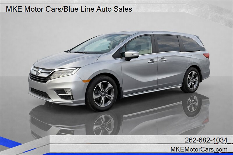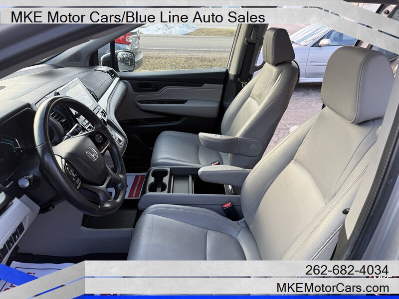 2018 Honda Odyssey Touring — Lunar Silver Metallic exterior with Gray leather interior. This is an excellent-condition family hauler powered by a smooth 3.5L V6 producing 280 hp and 262 ft-lbs of torque, delivering a comfortable blend of power and efficiency (EPA: 19 MPG city / 28 MPG highway).